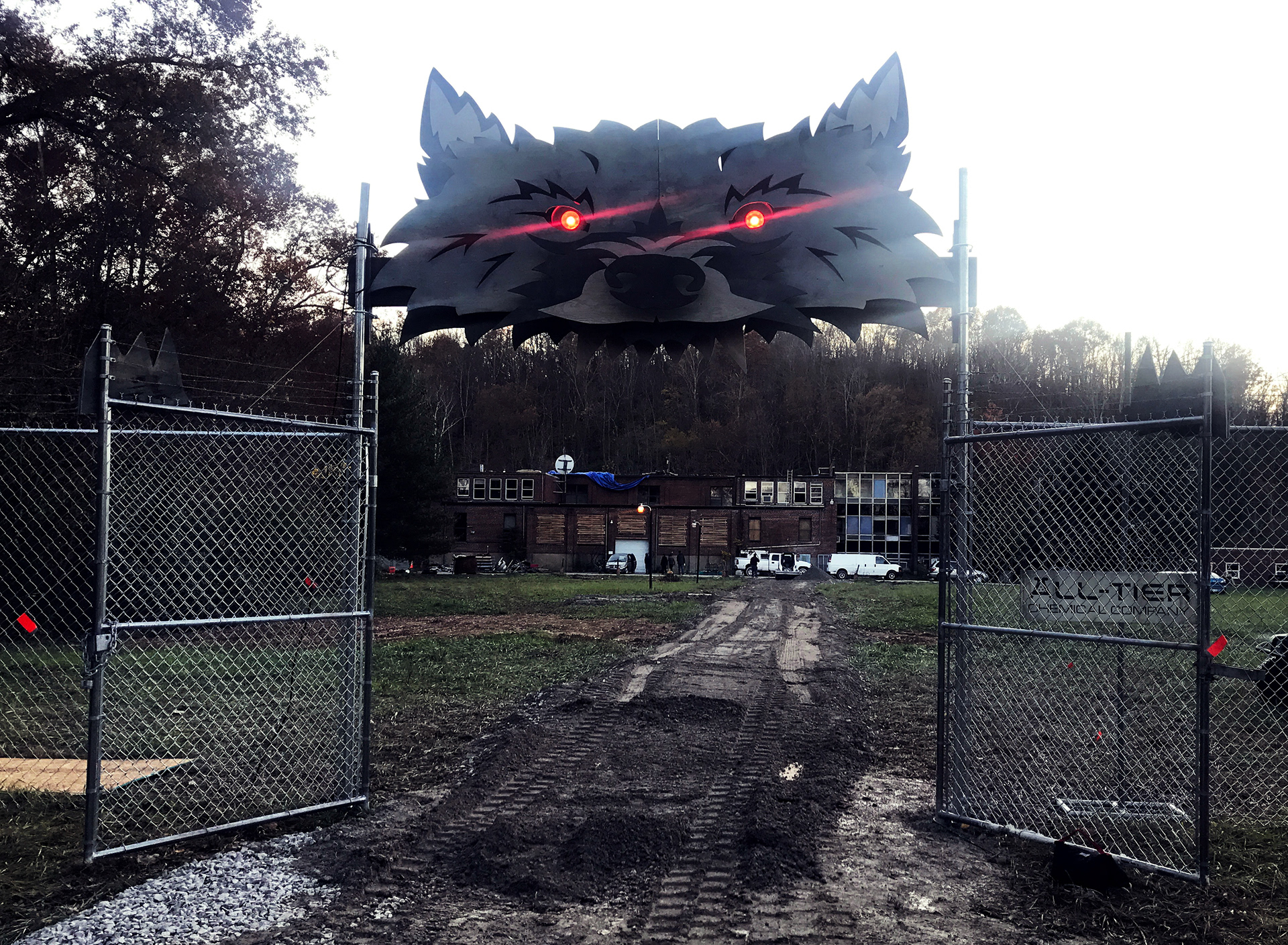 A remote location was chosen for the exterior to create a sense of isolation. A fence line with concertina wire was installed along the perimeter and a gravel road was laid down leading to the front.